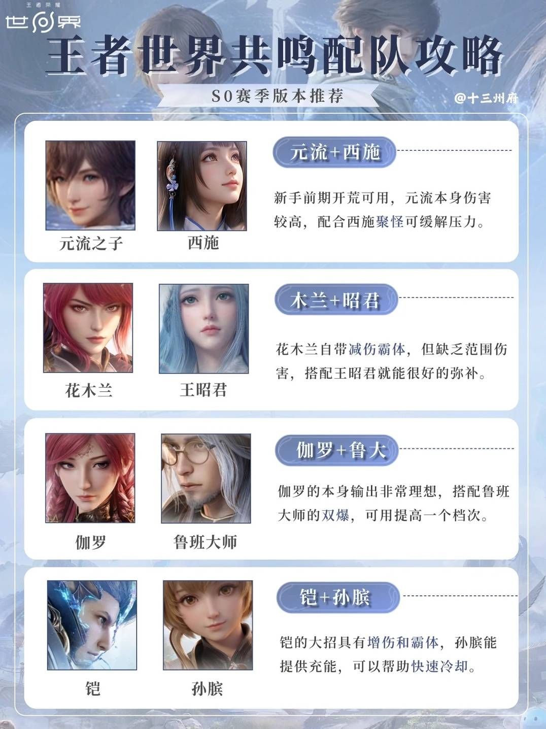 王者荣耀世界的配队叫做共鸣,玩家可搭配两名角色组成队伍。下面请看由“十三州府”带来的王者荣耀世界共鸣配队推荐,一起来看看吧。