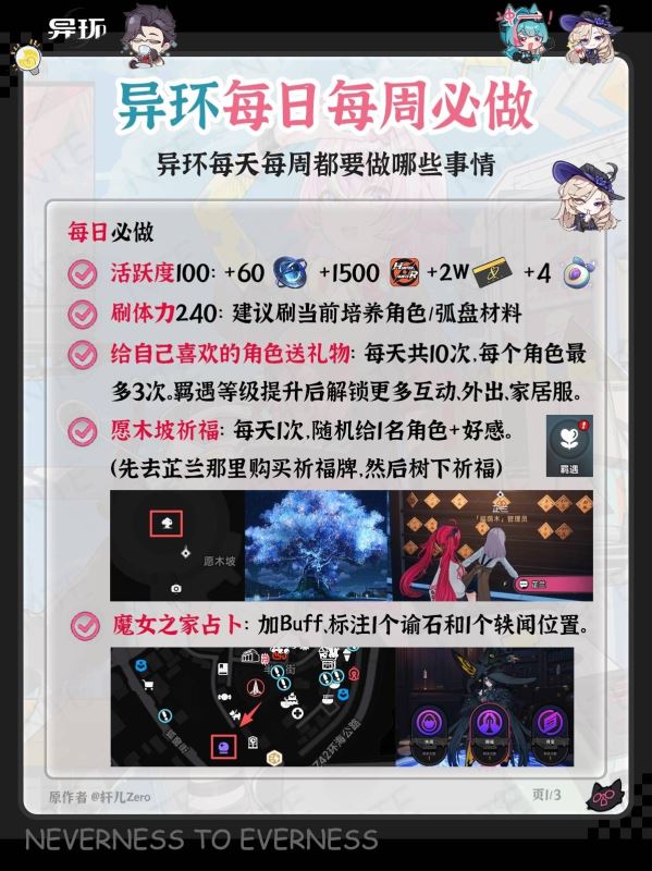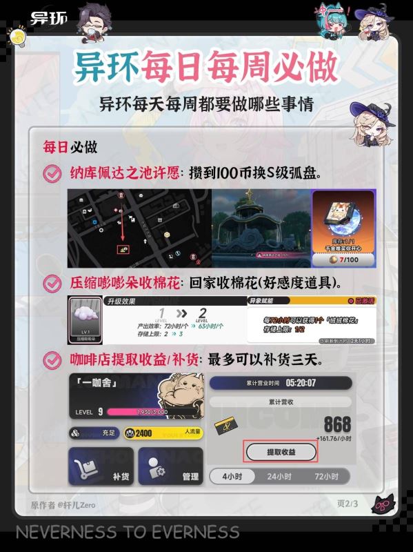 每日必做包含:活跃度、刷体力、给角色送礼物、愿木坡祈福、魔女之家占 卜、纳库佩达之池许愿、异象家具收棉花、咖啡店收钱补货。