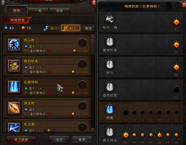 游龙的冷却不说了,伤害的话只能点这么多,放弃了无消耗因为护腕上打了灵气恢复这个基本用不上,眩晕和乱星是一个道理,这里没有点出枪技,因为在技能衔接的时候,切枪技简直就是坑爹,卖萌用的,还不如平A一下。