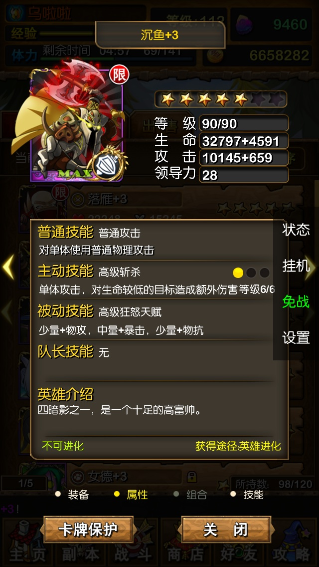 但是MT在3.0版本中加入了Raid玩法,也就是公会副本和野外BOSS,这些BOSS的血量都相当高。所以整体来说射射认为沉鱼应该是一个PVE型的英雄,在击杀公会BOSS的时候,当BOSS低于20%的时候,实际上还有好几百万甚至上千万的血量,这时沉鱼就能够不断的打出斩杀的增益效果,而且沉鱼本身拥有战士较高的血量和抗性,能够扛得住BOSS的群体攻击而一直站在场上输出。
