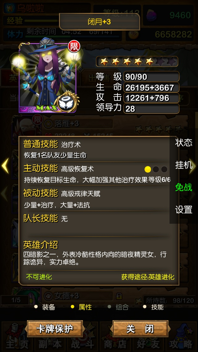 闭月的技能恢复术,能够恢复单体一定的血量(和治疗祷言的倍率基本持平),并且在接下去的3回合中持续回血,比例并不低,此外还能造成治疗增益效果,令治疗时提升治疗效果。