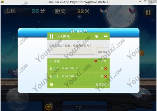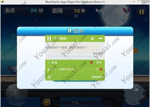 4、出现结果列表后,缩小,然后回到游戏让人物滑行同时暂停,打开烧饼看看那个值变成了5,保留唯一值,其他的删掉