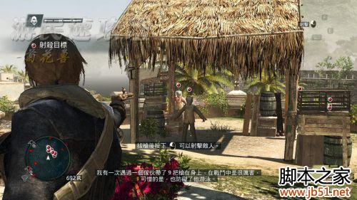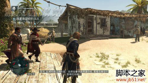 获得新武器——袖剑。刺客信条的标志性装备,从初代到第四正统续作,一直在对各方面进行修改,只有袖剑……只有它是恒久不变的。接下来要进行袖剑训练,分为几个阶段,第一阶段,随便杀一个稻草人就行了。第二阶段,进入草垛杀掉面前的目标。第三阶段,站到右边的那几个农民中间隐匿,然后杀掉身前的目标。第四阶段,爬到屋顶上然后从上方刺杀目标。跟朱利安对话,一边走一边说话……搞笑的是,罗杰斯之前提到过他老婆见过邓肯,所以爱德华对他老婆比较上心。