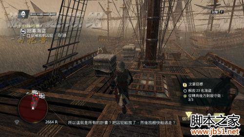 出来以后,这里没必要潜入,杀进去,杀他个鸡犬不留!完美同步是要解救23个水手,别看23个挺吓人,你一次性可以救七八个呢。地图上标记的这些任务目标,只要把他们都救下来就足够23个了,所以这个完美同步也是很简单的。然后这里有一些重型士兵,他们不能被秒杀,防御反击无效,普通攻击无效,连杀攻击无效,还会扔炸弹,要解决他们唯一的方式就是点空格破除其防御,然后再攻击,这样几刀就砍死了。另外就是在船与船之间移动的话,主要就是依靠桅杆和船头。去了就知道了。