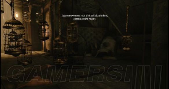 进入到房子的大厅内,大厅的桌子上放着一嗰鸟笼,所以要蹲走并且尽量缓慢地去到楼梯前并走上上层与艾琳会面。