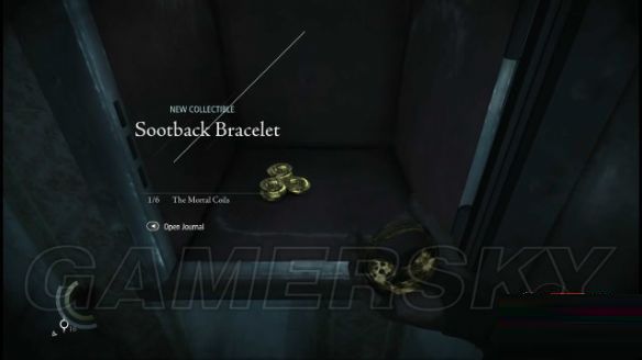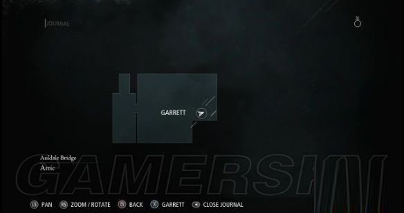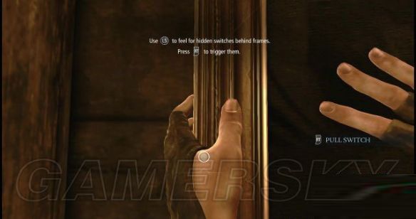 使用左摇杆,在画框边缘位置寻找机关所在,而就加勒特的手停留在左侧画框偏中下的位置时,屏幕出现了灰色圆圈标记或者是手柄会振动(也就是示意玩家,加勒特找到机关了),然后按一下RT键启动这幅画的机关,画就会自个儿缓缓上移,一嗰保险箱就出现了。