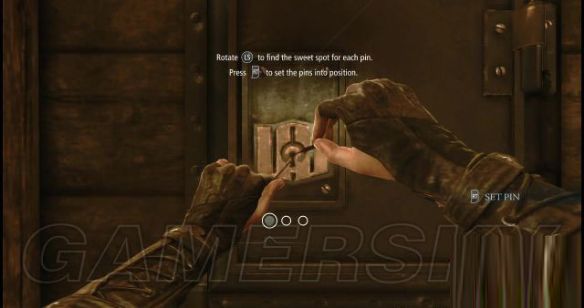 step5.②.保险箱当然也是上锁的,对着保险箱点击一下X键,那么加勒特就会掏出两条铁针,插入匙孔内,旋动左摇杆直至下方的第一嗰圆圈呈现灰色时按RT键,然后就是开启第二重的锁,方法也如此,一共开启三重锁即可(这种锁是一重接着一重的)。