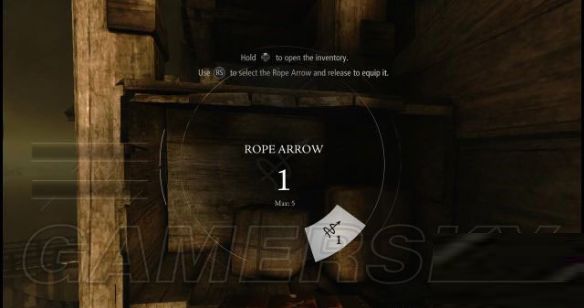 加勒特沿着窗户外的边缘走到阁楼旁边对方杂物的箱子前,发现了一嗰小宝盒,打开后发现一卷箭绳,按十字键↑打开物品栏(物品轮盘)再拨动右摇杆选择箭绳。