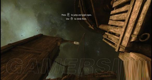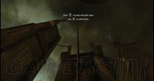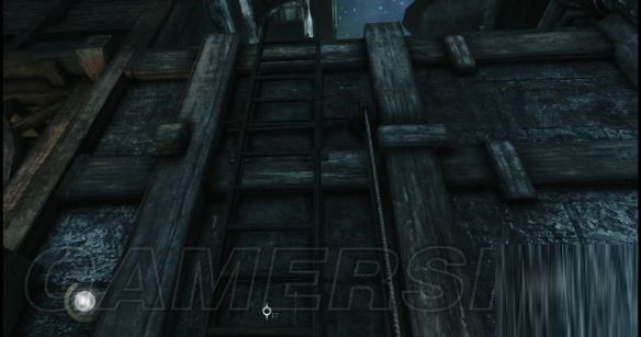 step22.在木架台的尽头位置,有一条麻绳,按住LT键拽到马上上,通过它可以爬到屋顶。