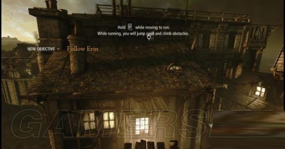 step7.直接按住LT键就可以展开奔跑,跳到对面的屋顶后并穿过一扇窗户,从室内的另一侧门口穿出,走过一条木板露天走廊后从倾斜的屋顶滑落到地面上。