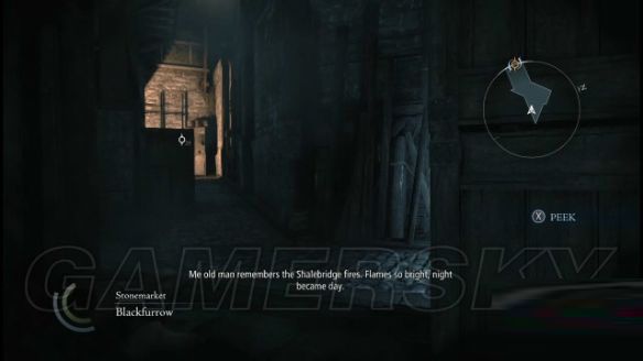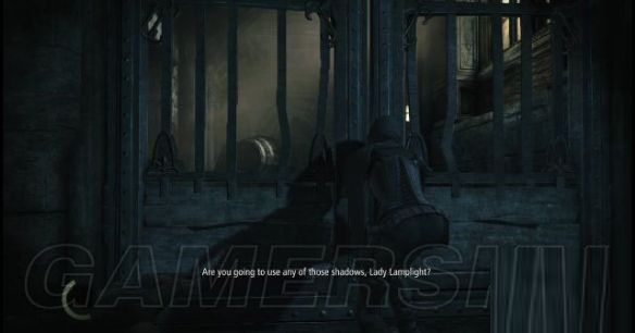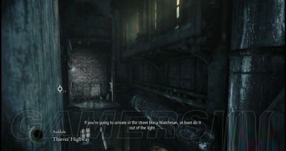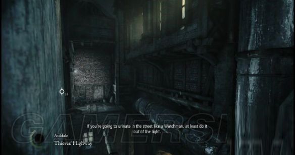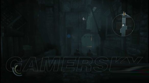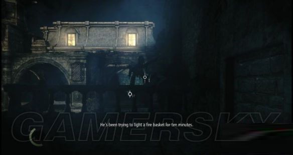 step9.落到地面后,在一栋木箱后有两名士兵正在谈论shalebridge的示威冲突(那场冲突战火纷飞,当时的夜空都快要被明火照亮),直接无视他俩,往西面街道的暗影位置使用一记猛冲即可。