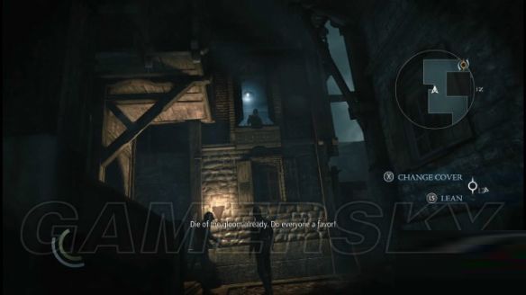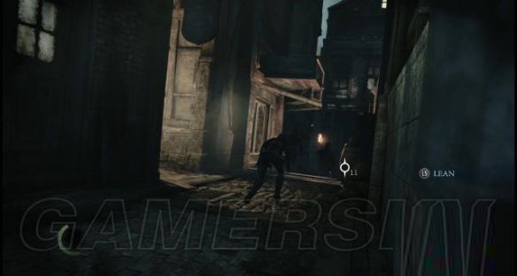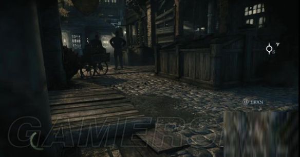 进入铁门,去到街道转角位置时,听到有男人的咳嗽声,对着街道右侧的墙角按一下X键可以让加勒特贴在墙上并拨动左摇杆窥视街道上的状况。
