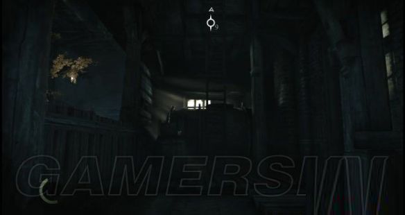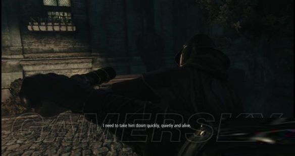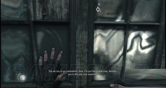随后从此房间入口右侧的窗户离开,然后踩上窗户左侧的木梁去到对面的房顶上(此时街上有一名大妈看见一名巡兵在大街上小解,便责骂他)。