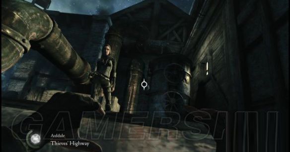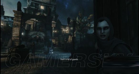 街上有两名巡兵,但他们很快就会往前方走去,艾琳亦快步跟上两人,去到街道的台阶前,艾琳炫耀了一下她的攀山爪,然后利用墙面上的铁网爬到屋顶上,因为加勒特没有这样的工具,所以就只好呆板一些。