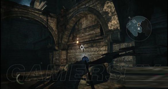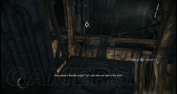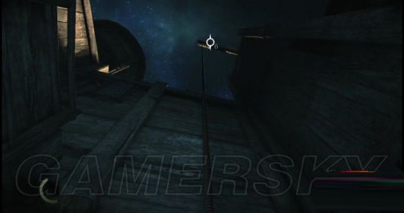 然后抬头往旁边高塔顶部突出的一条木条望去,然后按住RT键将聚焦并缓缓缩窄的焦点(圆圈)落在木条上,随后松开RT键就可以发射箭绳(取消射击按一下B键),箭绳就会束缚住木条。