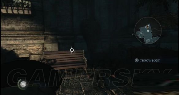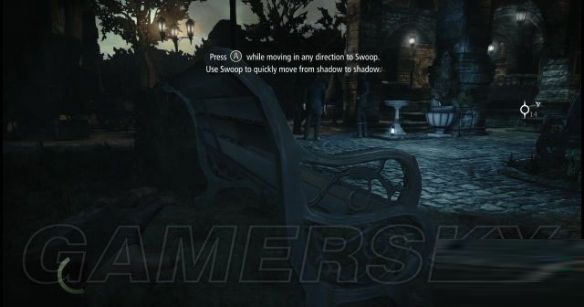 step15.跟随着艾琳走进右侧花丛后的暗影当中去,走到一张长凳后,需要按一下A键使用疾步猛冲穿过光亮的路面去到对面的草地上(其实不使用也可以的)。