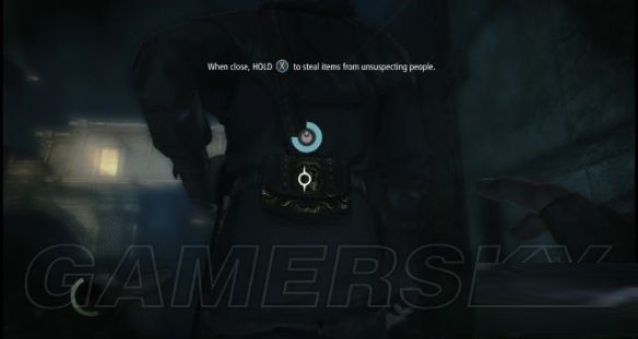 step16.然后按住LT键翻上一嗰花坛,就会看见右侧花园入口小门前站着一名背身的士兵,靠近他以后对着他腰间的包包按住X键盗取。