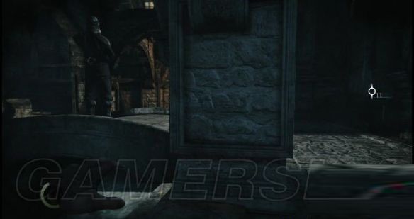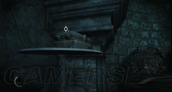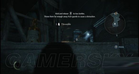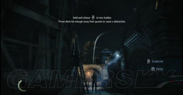 step21.木门后是一条街道,街道的中部有一名巡兵,先躲在街头处的一嗰木箱后,在木箱上拿取一嗰酒瓶,然后按住十字键←换出酒瓶,接着按RT键准备投掷酒瓶,此时会出现一条抛物线,将落点选择在巡兵的身后,然后松开RT键,将酒瓶掷出(如果砸到了巡兵,马上再拿一个酒瓶丢出去,引开他)。