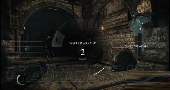 然后按住十字键↑,查看水之箭矢的快捷键,然后再按一下十字键←换出水之箭矢,按住RT键瞄准小溪上游位置的火把,射去一支水之箭矢,将其灭掉。