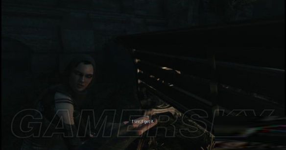 随后艾琳一下子就跳上了前方的窗户,因为加勒特没有工具所以那条路就没法选择了,往艾琳所在窗户右侧望去,会发现一条木梁可以通往右侧的气管平台上,这儿有一个手摇式开关。