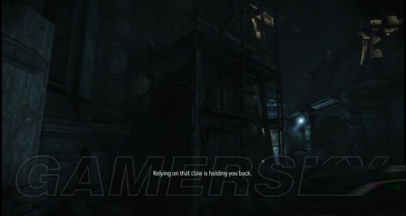 step11.台阶左侧有一个水管,水管表面有一嗰铁网可以爬到水管上方,水管会连接着一段房屋外墙木板,这木板能够延伸到一嗰名为“黑辙”的地方,翻过一度木墙后,就会看见那两名苦力所提及的钟楼。