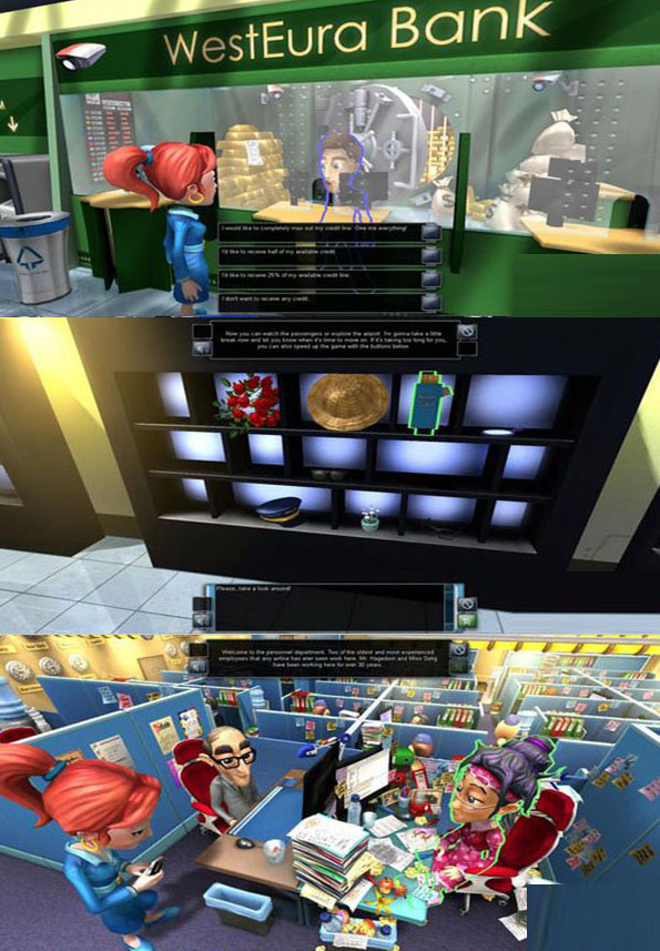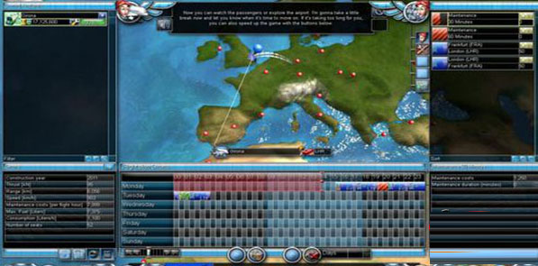 先点左边飞机,然后有几个闪着的按钮要你按一下,然后就双击一下右上的航线,这里是伦敦,所以要先点伦敦到法兰克福,不然点了法兰克福到伦敦,会空机到法兰克福之后再出发,空机会显示绿色条,蓝色条是正常,红色条是维修,还有个红色箭头条是延误.然后会走到机场大厅.然后四周走走.大厅有4个店(暂时发现)一个酒吧,一个商店,一个银行,一个旅行社.