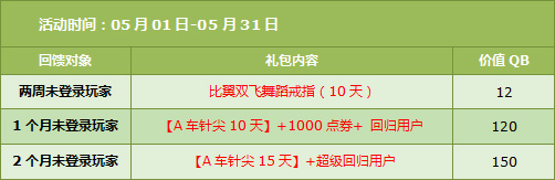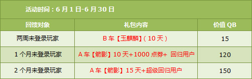 游戏攻略 > 网络游戏 > QQ飞车迎双节活动大全 点券回馈多倍经验等你拿 2014-05-30 10:47:54 脚本之家 回归好礼三重奏 活动内容: 注:仅10级以上玩家可获得回归好礼,且每个玩家只能获得其中一个。回归点券拥有【回归用户】道具的玩家,每天完成5局竞速赛,即可获得200点券。拥有【超级回归用户】道具的玩家,每天完成5局竞速赛,即可获得100点券+200消费券。回归经验 拥有【回归用户】或【超级回归用户】道具的玩家,每天登录游戏后,均可获得一张2小时双倍经验卡。 上一页 1 2 3 45 下一页 阅读全文