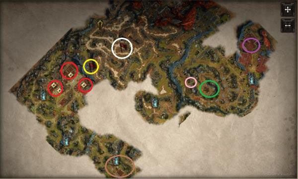 白圈是部落成员仓库,单独有个人守着的那个房间如果潜行进去出来会敌对,里面箱子能出橙,高级橙,15级以上。中间箱子我刷出了幻想法杖,有人打牌旁边箱子好像没啥好东西,地下室有一间牢房是用魔法锁锁住的,里面也是没有好东西,这个魔法锁可以在第一章奥尔胡办公室偷到轴卷解锁,分开两角色,用一个角色解锁,然后一群山脉战士会敌对,让他们杀死,然后用另一角色(要走远点,不可进入战斗)复活后无敌对。