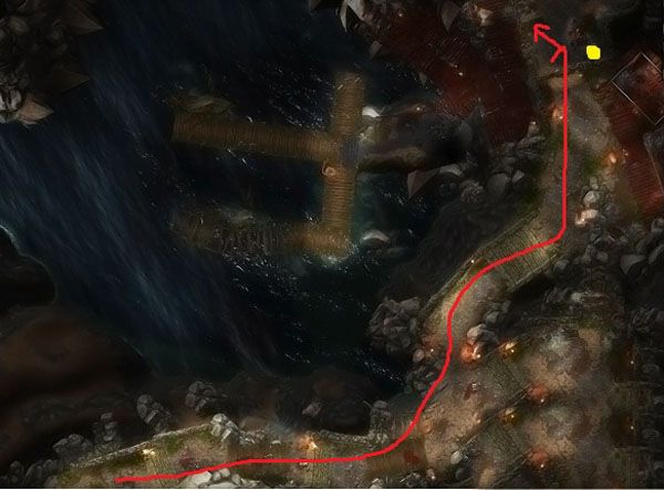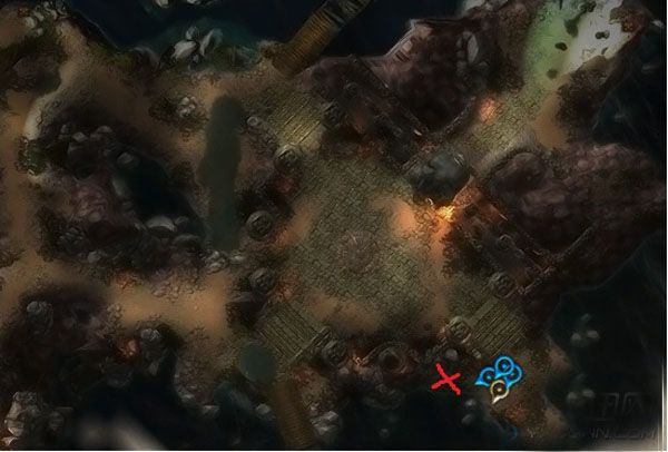 2.复活起来cain,主号一人潜行,无视路上敌人打开黄色处开关进入箭头处地道,开门机关在右图红叉处,站门前利用金字塔把cain拉到身边,然后让cain单独一人贴着左边C潜行到船长身后将箱子拖到物品栏,直接传送到黑湾传送门砸开宝箱得到第3血石。