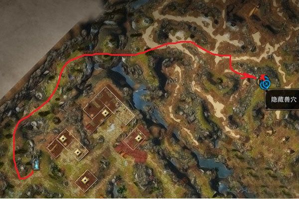 4.银谷出发,不需要接任务,按路线隐身配合潜行,C潜行时可以看到敌人视野范围不进入范围就不会被发现。箭头处是瘸腿人的任务,他正上方即为隐藏兽穴进去再说