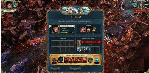 一出门就遭遇了第一场战斗,作为走格子回合制,玩家自己摸索着战斗吧,常规战斗方法我就不赘述了。第一场战斗把只要让小恶魔在后面放火球,地狱三头犬(Cerberus)和血腥祭司(Blood Priestess)往前推进就行了,非常简单。玩家在玩游戏前,最好先点选看一下各单位的天赋和攻防参数、血量兵数、以及属性抗性等。