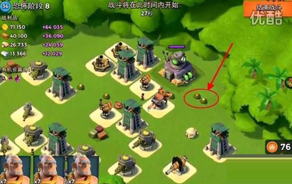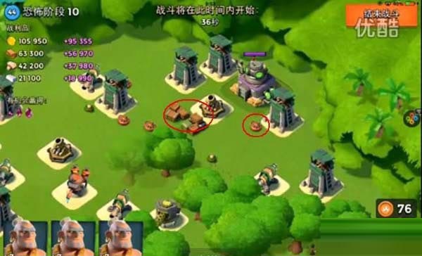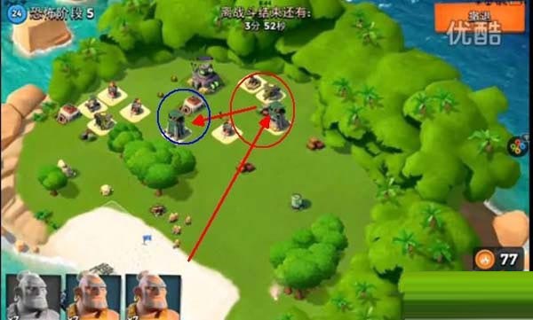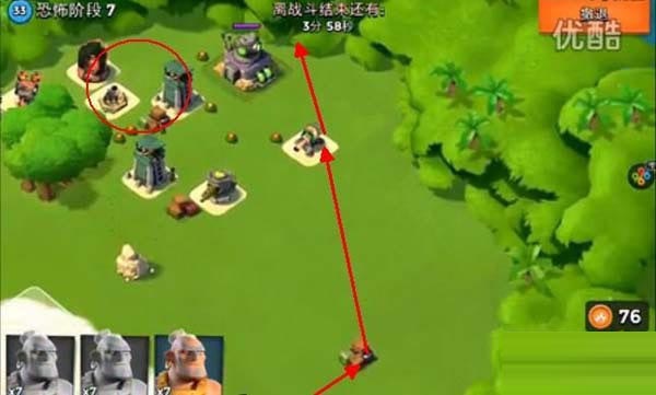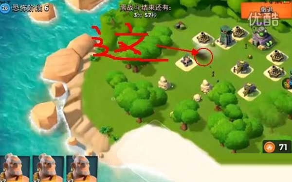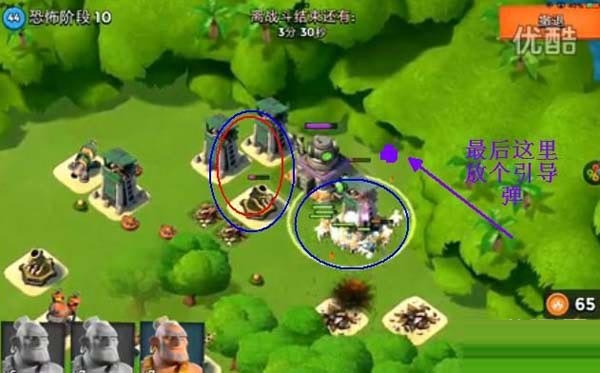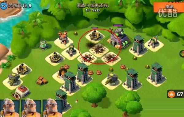 第三关按照路线只要将外面的那个防御打掉就可以直接打大本了!在红圈放震爆弹