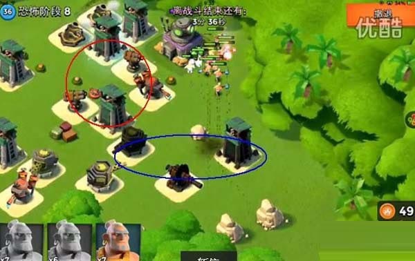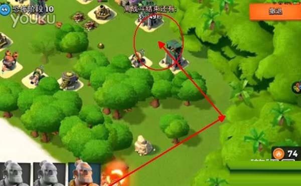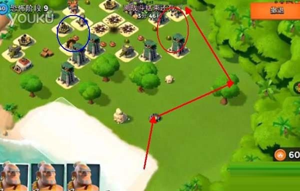 先用炮弹将蓝圈德个地雷炸掉,然后直接去打红圈里面的防御建筑,在红圈放冰冻弹,然后按照路线将下面一个建筑也打掉,打掉2个防御之后,引导到大本营,不用管下面的喷火器!