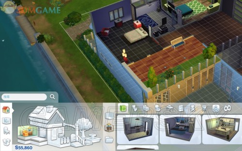 在建造模式下,屏幕下方是购买房屋部件和物品的工具。左侧有4个图标,分别是按“房间的部件”、“按房间分类物品”、“按功能分类物品”和“家庭物品清单”。