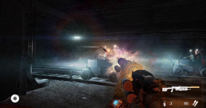 2、然后跟随可汗驾驶的铁轨车,向前行进着遭遇敌对势力,需要解决敌人。