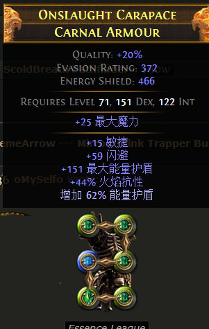 胸甲:高能量护盾的金装、作者之所以选敏捷+智慧底子的衣服是为了洗色方便(需要5绿1蓝,土豪的话换纯智慧高ES的底子更好,只要洗得出5绿1蓝的话)。