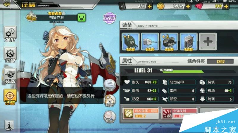 首先从这只开始,用过的人都知道,这只的弹幕很蛋 疼,主炮是横着一列的,副炮又是单点式输出,十分的难以命中,还没有鱼雷。但lz还是把她拿出来说了,因为她的防空很高,并且有一个能buff到全队巡洋舰的buff。