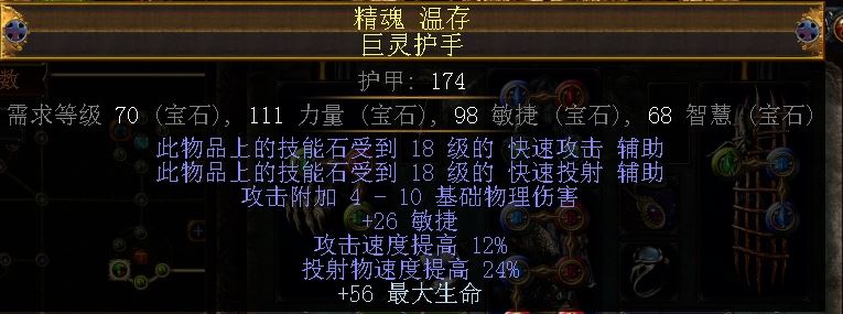 手套4L,1绿3红:闪电打击-多重打击-武器元素伤害-满血攻击物理伤害(闪电打击可以换成冰霜之刃清小怪能力一样根据个人爱好调整)
