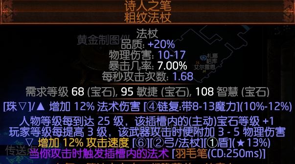 2个满攻速羽毛笔,法伤不重要,就是要满攻速,然后羽毛笔人物每升25级等级+1,所以不需要6L,技能宝石20级以后每升一级都是翻倍的涨伤害,所以当你瓦到21,21+100/24=25级灵体火球,那伤害多么夸张?羽毛笔的好处就是2个3L大于7L,而且我们BD不需要命中,因为羽毛笔触发不需要命中,只要你打空气就会触发,里面的法术技能又不需要命中,100%中【核心】