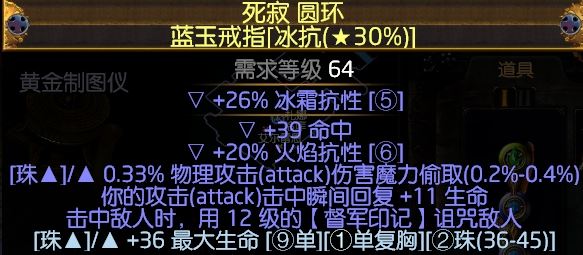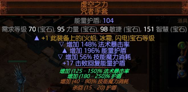 生命、暴击率、暴击伤、抗性最佳,我这里便宜淘了个顶血的,没暴击率,缺闪电抗性就附魔闪电抗性了