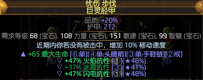 鞋:狂怒(绿)-击中回血(红)-高阶多重投射(绿)-暴击得暴击球(蓝)狂怒直接买20品质,有10%攻速,减少天赋压力,这里全部要20品质,很重要