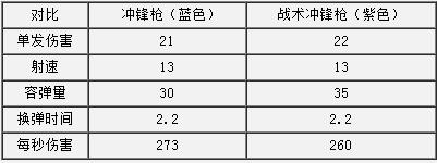 可以看出蓝色冲锋枪的数据从伤害上要高出紫色战术冲锋枪,只是容弹量要少5发。