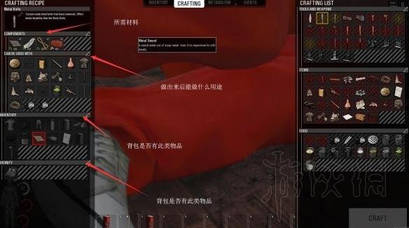 左边第一个是物品介绍,然后第一栏是制作此物品需要什么东西,第二栏是此物品制作好后有什么用途,往后都是你背包里面是否有这些物品,很无脑的。