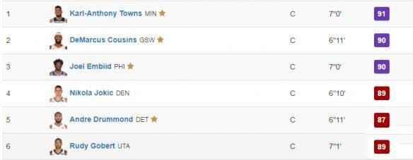 从位置来看,新狼王卡尔·安东尼·唐斯成为了联盟第一中锋,德马库斯·考辛斯和“大帝”乔尔·恩比德紧随其后,全能现代中锋的代表人物“约老师”尼古拉·约基奇以89的能力值排在第四。联盟第五中锋是能力值87的安德烈·德拉蒙德以及爵士内线铁闸鲁迪·戈贝尔。