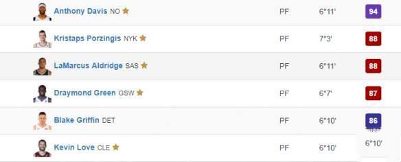 在大前锋位置上,安东尼·戴维斯毫无疑问是联盟第一大前锋,排在第二位的是尼克斯的“波神”克里斯塔普斯·波尔津吉斯和马刺队的拉马库斯·阿尔德里奇,他们的能力值是88,看起来大前锋位置的竞技没有中锋这么激烈,第一大前锋实在是领先其他人太多了。第四大前锋是勇士队能力值87的德鲁蒙德·格林,看到这里是不是再一次感叹勇士队的恐怖呢?布雷克·格里芬和凯文·勒夫同样以86的能力值成为了并列第五大前锋。