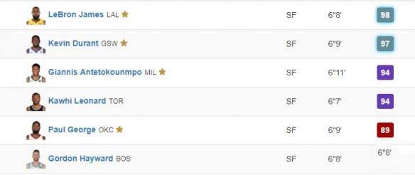 勒布朗·詹姆斯和凯文·杜兰特两位能力值第一第二的人把持住了小前锋前二的两个位置。能力值高达94的字母哥”扬尼斯·安特托孔博和科怀·伦纳德只能屈居第三,第四位。由于保罗·乔治在游戏中的第一位置是小前锋,能力值89的他成为了第五小前锋。在他身后还有能力值88的戈登·海沃德在虎视眈眈。这真是小前锋的时代,小前锋的位置真是强到爆炸啊。
