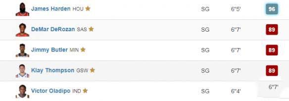 总能力值排名第三的上赛季常规赛MVP詹姆斯·哈登当仁不让地成为第一分位。第二分位是今夏和科怀·伦纳德进行交换的能力值89的玛尔·德罗赞,全能战士吉米·巴特勒和克莱·汤普森。分位的位置和大前锋一样,第一实在是领先其他人太多了。步行者领袖维克托·奥拉迪波以88的能力值成为第五分位。
