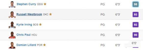 控卫的位置上,能力值95的斯蒂芬·库里排名第一,能力值同为93的拉塞尔·威斯布鲁克和凯里·欧文把持着第二第三位。开拓者的核心,能力值90的达米安·利拉德以及能力值同样为90的火箭大脑克里斯·保罗分列第四,第五位。