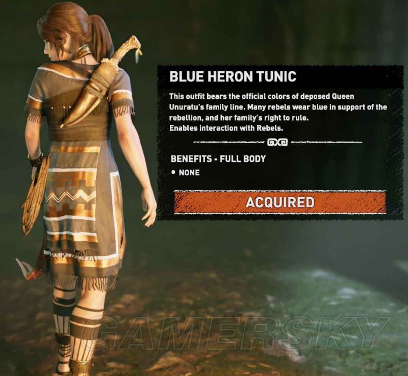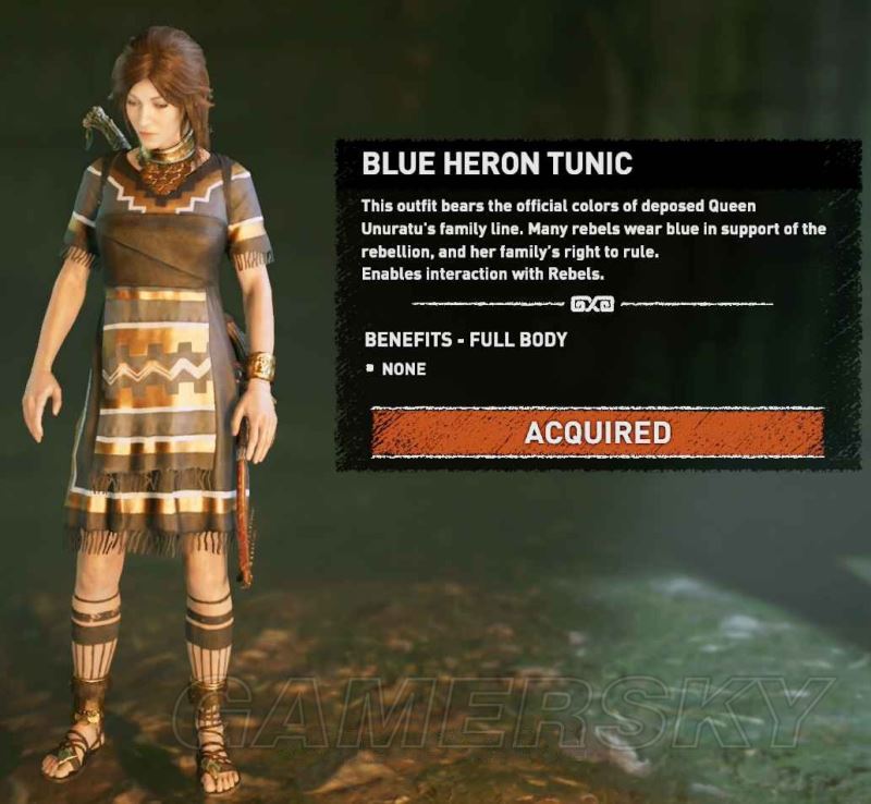 这件蓝色的服装其实代表Queen Unuratu家族,因为许多反叛者穿着蓝色支持叛乱并且拥护这个家族的权利。穿上这件衣服可以与反叛者互动。