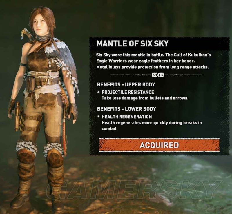 这套服装是Six Sky战斗时所穿的。库库尔坎的勇士为了对她表示尊敬会佩戴鹰羽护肩。金属镶嵌可以保护佩戴者免受远程攻击。